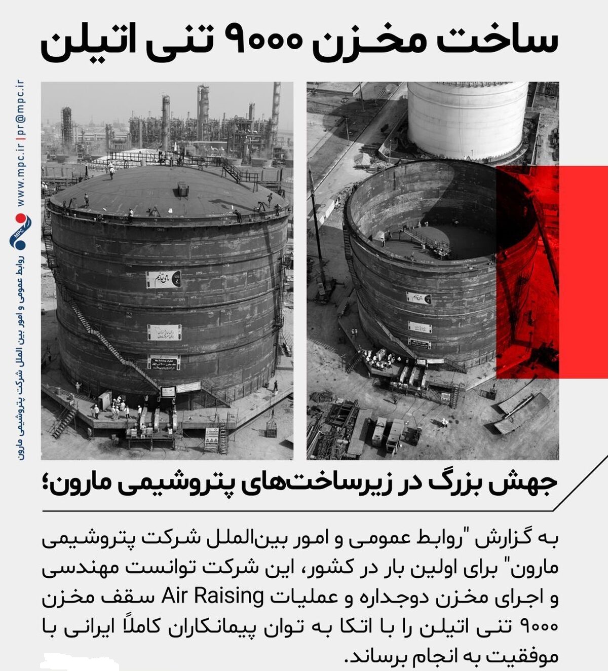 به گزارش ارجانیان به نقل از روابط عمومی و امور بین الملل شرکت پتروشیمی مارون برای اولین بار در کشور، این شرکت توانست مهندسی و اجرای مخزن دوجداره و عملیات Air Raising سقف مخزن ۹۰۰۰ تنی اتیلن را با اتکا به توان پیمانکاران کاملاً ایرانی با موفقیت به انجام برساند.