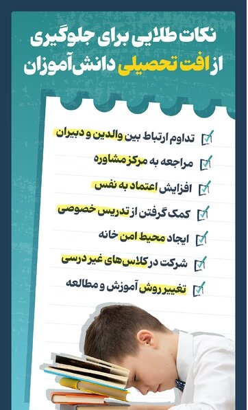 افت تحصیلی موضوعی بهشمار میرود که بسیاری از والدین و دانشآموزان با آن مواجه هستند و همیشه بهدنبال بهترین راهها هستند تا بتوانند این مشکل را به راحتی و بدون کوچکترین دغدغهای رفع کنند. در این اینفوگرافیک نکات طلایی برای جلوگیری از افت تحصیلی را مشاهده میکنید.