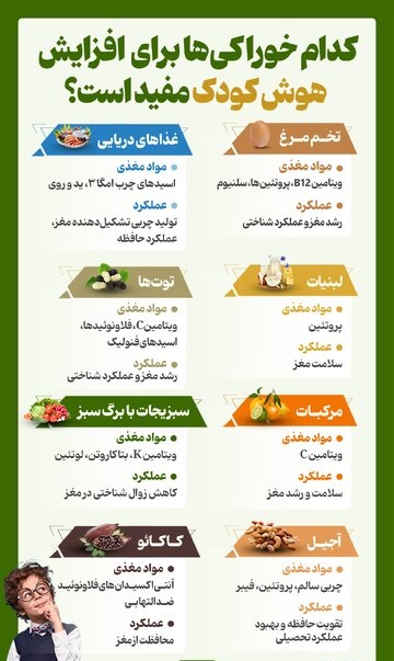 وقتی صحبت از پرورش و تغذیه مغز در کودکان به میان میآید، غذا برای باهوش شدن کودک نقش مهمی ایفا میکند. مصرف مواد غذایی صحیح میتواند به بهبود عملکرد مغز، حافظه و تمرکز کمک کند. در این اینفوگرافیک به معرفی چند مورد از مواد غذایی که برای باهوش شدن کودک کمک میکند، میپردازیم.
